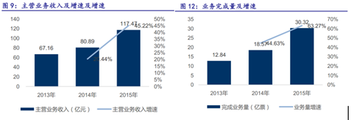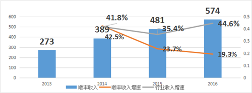 注: 因?yàn)轫権S在最新年報中沒有給出詳細(xì)的國內(nèi)快遞業(yè)務(wù)(時效產(chǎn)品)的件量數(shù)量。只給了一個總體25.8億票和31%的增速,前后口徑應(yīng)不同,所以2016年份額反增加。但不影響結(jié)論。若按2015年占比為8.22%,若16年件量增速31% ,份額實(shí)際已降至1.31/1.5*8.22%=7.1%左右。
