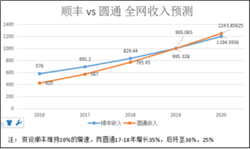 順豐全網(wǎng)收入份額一度達(dá)20%。但隨著增速落后逐年下滑,很可能要失去老大地位。圓通申通單票運(yùn)費(fèi)是順豐的1/2,只要件量是順豐的2倍。就有可能超過順豐。2016年2月圓通老板娘張小娟在杭州兩會上透露圓通2015年總件量約35億件(實(shí)際30億票),全網(wǎng)營收350億元(實(shí)際可能為300億元)。根據(jù)圓通發(fā)布的業(yè)績預(yù)告,2016年件量和收入都大于40%的增長。全網(wǎng)收入可能超420億元。假若保持這種趨勢下去,圓通甚至中通、申通等都可能在接下來三五年內(nèi)在全網(wǎng)收入上超越順豐, 甚至比順豐提早突破千億大關(guān)。順豐可能掉至三四名甚至更后。