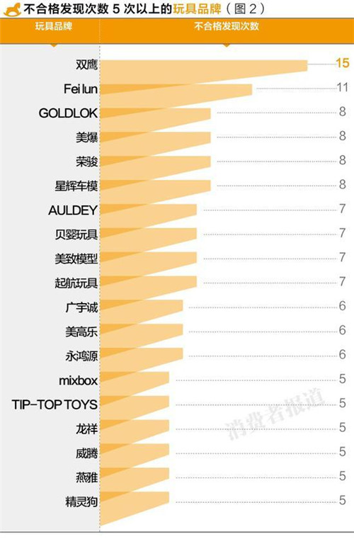 雙鷹與飛輪的不合格次數(shù)超過(guò)10次,而美高樂(lè)、星輝車(chē)模等較知名品牌也數(shù)次登上黑榜。兒童玩具的抽檢不合格項(xiàng)目主要集中在標(biāo)志與危險(xiǎn)警示不規(guī)范、以及小零件、尖端傷害等方面。