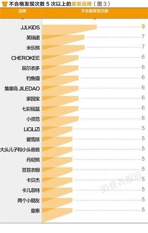 數(shù)據(jù)分析顯示,由郭濤父子代言的有30年創(chuàng)立歷史的季季樂(lè)(JJLKIDS)童裝的不合格發(fā)現(xiàn)次數(shù)竟高達(dá)9次。而兒童與嬰幼兒服飾的不合格項(xiàng)目集中在標(biāo)識(shí)、纖維含量、pH值、使用說(shuō)明等方面。