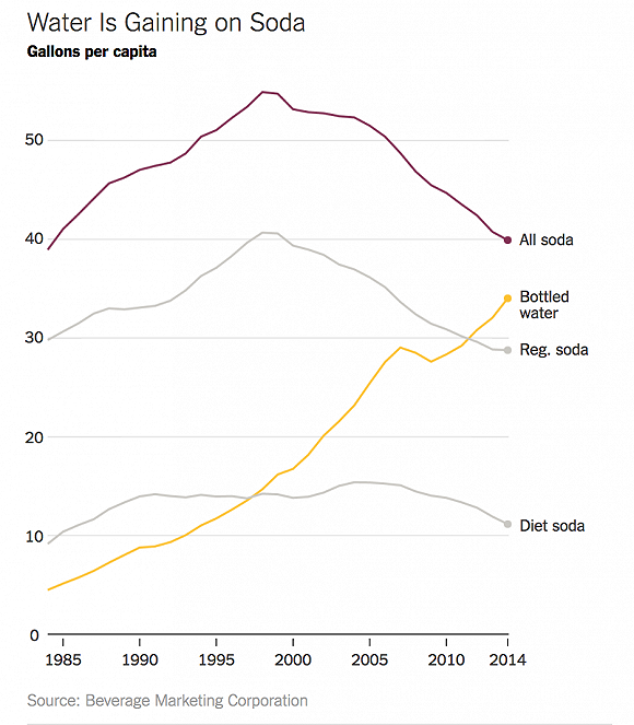 1960年代到1990年代,汽水公司經(jīng)歷過(guò)銷(xiāo)售量猛漲。而過(guò)去二十年里,汽水在美國(guó)的銷(xiāo)量暴跌了將近25%。而行業(yè)調(diào)研機(jī)構(gòu)Beverage Digest最新數(shù)據(jù)顯示,美國(guó)汽水2016年的銷(xiāo)量滑入了近31年來(lái)的最低谷,較去年銷(xiāo)量又降低了0.8%。