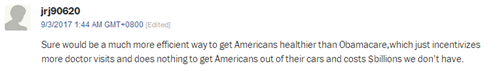 網(wǎng)友jrj90620:“對(duì)美國人的健康來說,共享單車可比奧巴馬醫(yī)保更有效?!?/font>
