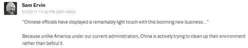 網(wǎng)友Sam Ervin:“‘中國官員對(duì)蓬勃發(fā)展的共享單車業(yè)務(wù)表現(xiàn)出柔性的監(jiān)管姿態(tài)?!绹灰粯?,中國正在積極地改善環(huán)境,而不是破壞環(huán)境?!?/font>