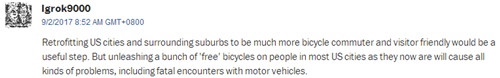 網(wǎng)友Igrok9000:“使用自行車確實(shí)利于改善城市和郊區(qū)環(huán)境。但對(duì)于美國大多數(shù)城市來說,一下子涌現(xiàn)出大量自行車,會(huì)引發(fā)各種各樣的問題,比如與機(jī)動(dòng)車相撞?!?/font>