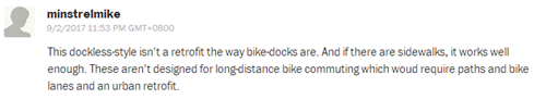 網(wǎng)友minstrelmike:“無樁式共享單車不適合遠(yuǎn)距離的騎行者,解決這個(gè)問題還得靠自行車道的規(guī)劃和城市的改造。”