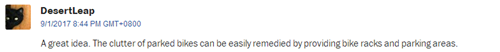 網(wǎng)友DesertLeap:“共享單車是好主意。擔(dān)心自行車停放引發(fā)混亂,可以增加自行車架和停車場(chǎng)?!?/font>