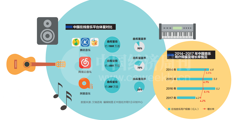 2016年7月,QQ音樂與酷我音樂、酷狗音樂并入騰訊音樂旗下后,騰訊開始對數(shù)字音樂版權著重布局。2017年3月和5月,騰訊音樂先后拿下中國大陸地區(qū)對環(huán)球音樂所擁有的音樂詞曲獨代權和數(shù)字版權分銷權,并為此付出了3.5億美元現(xiàn)金及購買環(huán)球音樂1億美元期權的代價。“截至目前,全球范圍內有200多家唱片公司持有數(shù)字音樂的版權,目前90%以上都已經被騰訊拿下。”一位網(wǎng)易云音樂內部人士告訴《中國經濟周刊》記者,騰訊音樂目前擁有的版權數(shù)量、廣度和對版權的投入都是業(yè)內第一,其中不少是“獨家代理權”,相當于緊緊地扎起了一個籬笆。