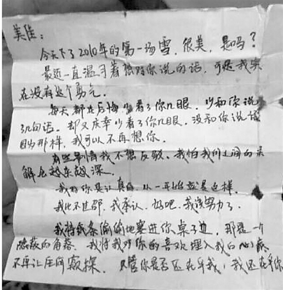 昨天網友“來呀來呀快來打我呀”發(fā)了一條微博,說的是他的學妹于無意間在教室桌子的縫隙里,發(fā)現(xiàn)了一封情書——情書是一個男生在2010年寫給一個叫“美佳”的人。