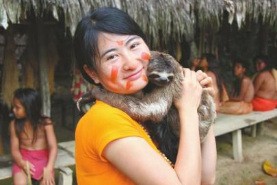 鄧深很喜歡小動(dòng)物,這是她在旅行中和樹懶的合影。