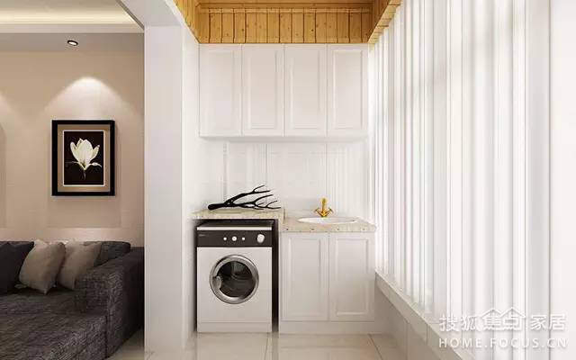 為了避免洗衣機(jī)影響整體簡(jiǎn)約的美感,把洗衣機(jī)組合柜設(shè)置在落地窗封閉式陽臺(tái)的一側(cè)角落里,戶主將這個(gè)角落打造成了一個(gè)簡(jiǎn)單又實(shí)用的空間,洗衣機(jī)左側(cè)是洗手池,上方有柜子,可以用來放置洗衣粉等用品,洗衣機(jī)上方的綠色植物又可以起到點(diǎn)綴作用,柔化了洗衣機(jī)的生硬形象。