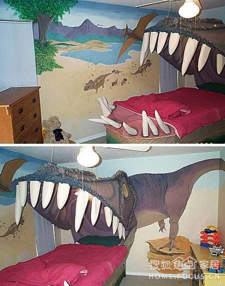這是一個自帶3D效果的臥室床頭背景墻,從正面看還以為只是一只大恐龍。從側(cè)面我們看到的卻是一個突出的恐龍嘴。不知道躺在這樣的床上是怎樣的感覺。