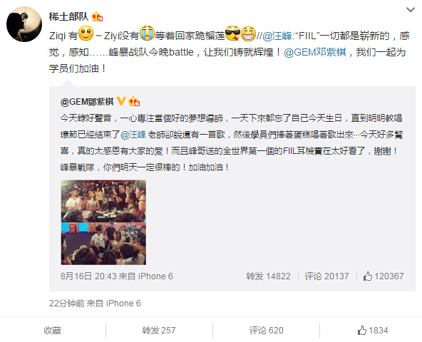 近日,一張章子怡發(fā)布會挺著“大肚”的照片引發(fā)網(wǎng)友熱議,雖然只是假扮孕婦,卻引來大波網(wǎng)友詢問何時準備要寶寶,可見網(wǎng)友對兩人感情生活的關(guān)注。8月16日,鄧紫棋在微博上曬出汪峰為其過生日的照片,17日中午,汪峰轉(zhuǎn)發(fā)此微博并稱要為學(xué)員們加油,17日下午,章子怡回復(fù)汪峰:“Ziqi有~Ziyi沒有,等著回家跪榴蓮?!?/font>