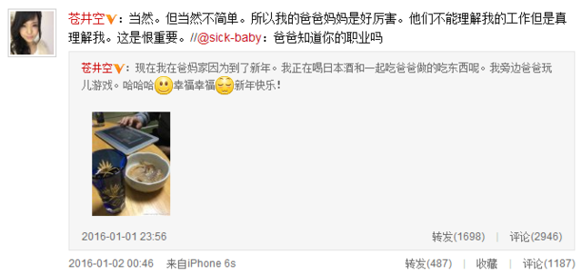 隨后有網友留言,問及“你爸爸知道你職業(yè)嗎?”蒼井空很是坦誠回答:“當然。但當然不簡單。所以我的爸爸媽媽是好厲害。他們不能理解我的工作但是真理解我。這是很重要。”更有網友敏感地問道:“蒼老師的父親也看過她的作品嗎?”蒼井空反問“如果你爸爸的話怎么樣”讓網友為其機智點贊。