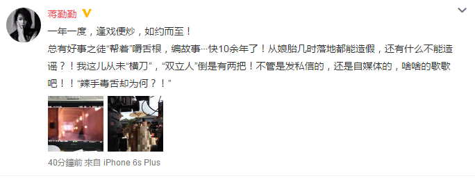 近日,網(wǎng)上流傳出一些關(guān)于蔣勤勤曾橫刀奪愛,從女演員手中搶走陳建斌的緋聞。25日,蔣勤勤發(fā)微博辟謠,表示自己已被造謠了十幾年,并否認(rèn)自己曾經(jīng)插足他人感情。蔣勤勤還勸告某些造謠者“歇歇吧”:“一年一度,逢戲便炒,如約而至!總有好事之徒“幫著”嚼舌根,編故事……快10余年了!從娘胎幾時(shí)落地都能造假,還有什么不能造謠?!我這兒從未“橫刀”,“雙立人”倒是有兩把!不管是發(fā)私信的,還是自媒體的,啥啥的歇歇吧!!辣手毒舌卻為何?!”
