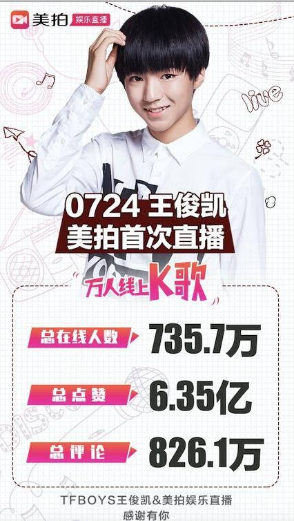 “大哥”王俊凱作為TFBOYS的隊(duì)長及團(tuán)隊(duì)核心,一直備受90后乃至00后粉絲追捧。7月24日下午5點(diǎn)王俊凱開啟了在美拍的個人直播首秀,與“小螃蟹”們進(jìn)行了長達(dá)五十分鐘“嗨歌模式”。直播開始正式開始后,觀眾突破六百萬,點(diǎn)贊數(shù)超過五億,而總評論數(shù)更是達(dá)到了驚人的826萬,毫無疑問成為全網(wǎng)互動數(shù)最高的直播,同時更輕松登上微博微博熱門話題榜單,收獲1.5億閱讀量。