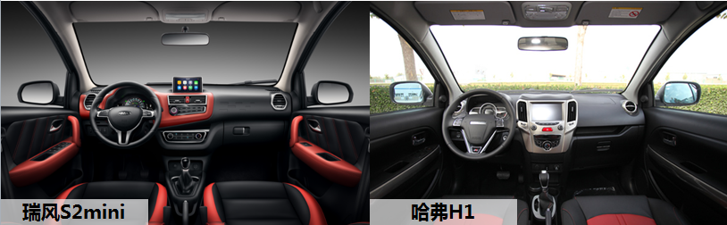 內(nèi)飾設(shè)計(jì)方面,瑞風(fēng)S2mini采用紅黑配色,給人活潑時(shí)尚之感。且中控臺造型簡潔,懸浮式顯示屏的點(diǎn)綴更顯科技感。哈弗H1的內(nèi)飾設(shè)計(jì)雖同走簡潔風(fēng),但其中控臺銀色面板卻稍顯老氣,顯然與90后追逐新鮮感的個(gè)性不符。