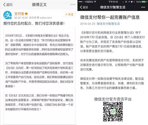 22日,支付寶官方微博發(fā)表聲明稱,“支付寶將在《辦法》出臺后正式啟動相關系統(tǒng)升級與改造工作,并且?guī)椭脩暨M行相關操作。”25日中午,微信支付在其官方賬號“微信支付智慧生活”發(fā)布了題為《微信支付幫你一起完善賬戶信息》的短文。