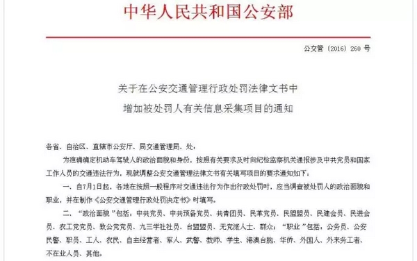 2016年7月1日起,機(jī)動(dòng)車駕駛?cè)藢?shí)施交通違法行為后,公安交通管理部門在對(duì)交通違法作出行政處罰時(shí),被處罰人的政治面貌和職業(yè)信息將被調(diào)查,涉及中共黨員和國(guó)家工作人員的將被通報(bào)紀(jì)檢監(jiān)察機(jī)關(guān)。