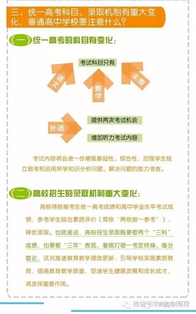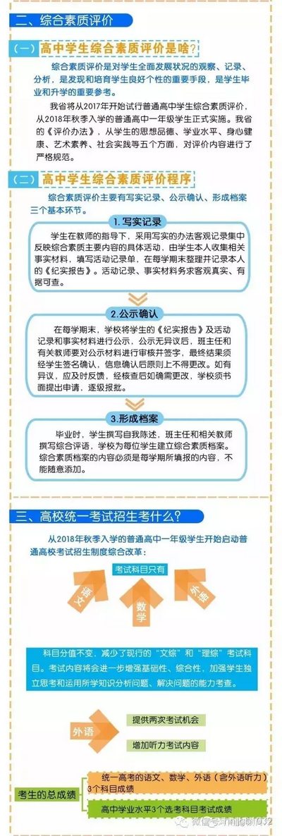 按照《方案》要求,我省從2018年秋季入學(xué)的普通高中一年級(jí)學(xué)生開始啟動(dòng)高考綜合改革,考生總成績由統(tǒng)一高考的語、數(shù)、外3科成績和高中學(xué)業(yè)水平3個(gè)選考科目成績組成。招生錄取實(shí)行基于統(tǒng)一高考成績和高中學(xué)業(yè)水平考試成績、參考學(xué)生綜合素質(zhì)評(píng)價(jià)擇優(yōu)錄取機(jī)制。