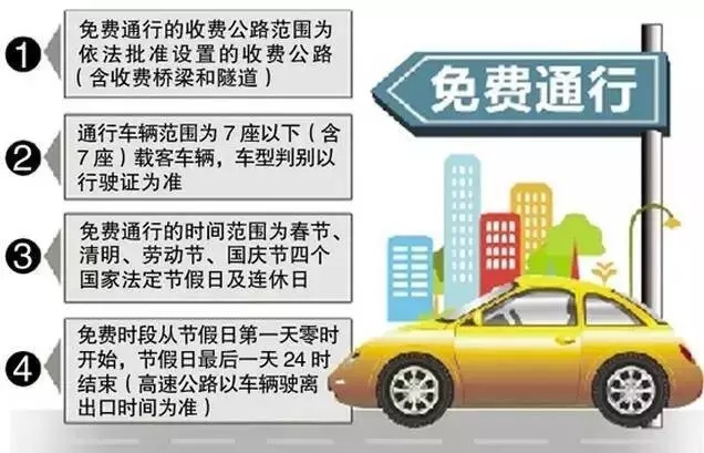 根據(jù)《重大節(jié)假日免收小型客車通行費(fèi)實(shí)施方案》,高速公路免費(fèi)通行的的具體政策如下:(一)免費(fèi)通行的時(shí)間范圍為春節(jié)、清明節(jié)、勞動(dòng)節(jié)、國(guó)慶節(jié)等四個(gè)國(guó)家法定節(jié)假日,以及當(dāng)年國(guó)務(wù)院辦公廳文件確定的上述法定節(jié)假日連休日。免費(fèi)時(shí)段從節(jié)假日第一天00:00開始,節(jié)假日最后一天24:00結(jié)束(普通公路以車輛通過收費(fèi)站收費(fèi)車道的時(shí)間為準(zhǔn),高速公路以車輛駛離出口收費(fèi)車道的時(shí)間為準(zhǔn))。