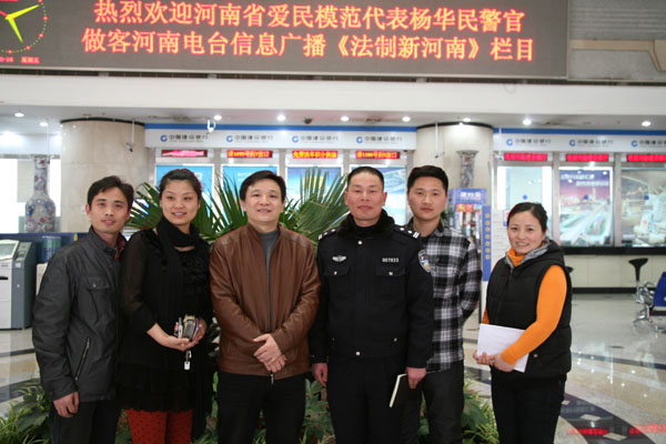 2012年3月16日下午四點,中央電視臺攝制組進入河南電臺信息廣播《法制新河南》節(jié)目直播間進行了拍攝。在節(jié)目中做客的是全國愛民模范鄭州市花園路農(nóng)業(yè)路楊華民交通示范標準崗崗長楊華民。