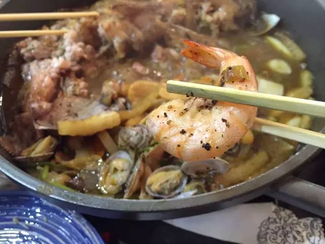 以魚、扇貝、大蝦和時(shí)蔬為鍋底,先燜制,后以米酒澆鍋,點(diǎn)火后,能看到火焰在食材上跳躍,聞到淡淡的酒香,最后的醬料可以拌意面吃,有黑椒、麻辣和酸菜三種口味。