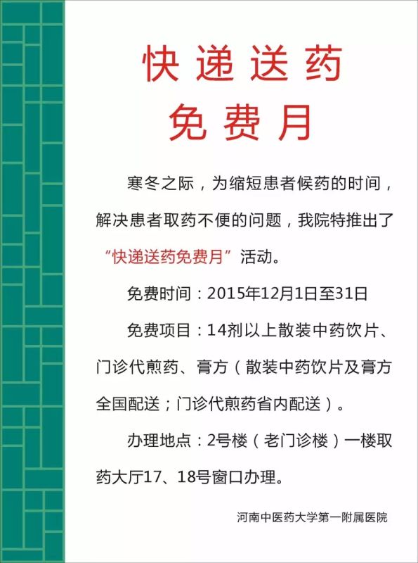 河南中醫(yī)學院第一附屬醫(yī)院藥學部—— 讓患者吃上道地好中藥即日起,該院推出“快遞送藥免費月”惠民活動。
