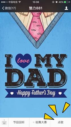 本周日就是父親節(jié)了。平時(shí)向爸爸們表達(dá)情意的機(jī)會(huì)可能不多,趁著節(jié)日,你可別落下。特意給親愛(ài)的老爸準(zhǔn)備了一份禮物,6月14日——6月16日,點(diǎn)擊菜單欄中的“點(diǎn)歌”或直接點(diǎn)擊本文底部的閱讀原文,進(jìn)入點(diǎn)歌互動(dòng)頁(yè)后點(diǎn)擊“立即點(diǎn)歌”,填寫并提交姓名、手機(jī)號(hào)、所點(diǎn)歌曲名稱、以及你想對(duì)父親說(shuō)的話。