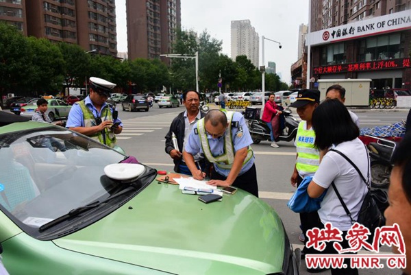 在路口的西南角,停著一輛出租車。鄭州市交警四大隊兩名民警正向雙方當事人詢問情況。