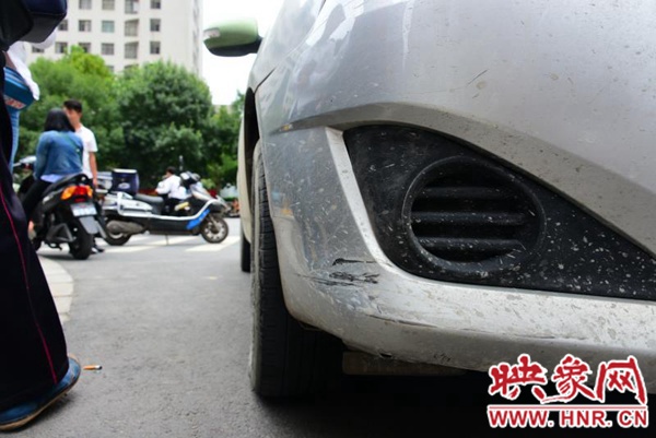 檢查發(fā)現(xiàn),出租車右前車輪前的保險桿上有幾道清晰的刮蹭痕跡,但出租車司機否認是今天留下的。
