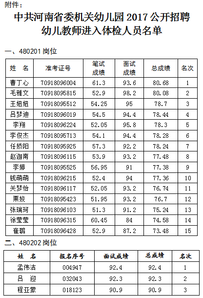 中共河南省委機(jī)關(guān)幼兒園2017年公開(kāi)招聘幼兒教師面試工作已經(jīng)結(jié)束。根據(jù)總成績(jī)排名,按照招聘人數(shù)與體檢人數(shù)1:1的比例,確定480201崗位15名考生進(jìn)入體檢環(huán)節(jié),480202崗位3名考生進(jìn)入體檢環(huán)節(jié)。