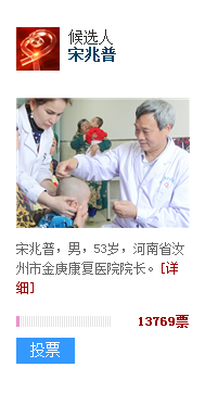 映象網(wǎng)汝州訊(記者 楊增強)河南仁醫(yī),感動中國!映象網(wǎng)記者12月26日獲悉,“感動中國”2017年度候選人物已經(jīng)投票已經(jīng)開始,由河南省委宣傳部選報的我省候選人汝州市金庚康復醫(yī)院院長宋兆普入圍,網(wǎng)友可關(guān)注央視網(wǎng)投票頁面(點擊下圖)為這位河南仁醫(yī)進行投票。