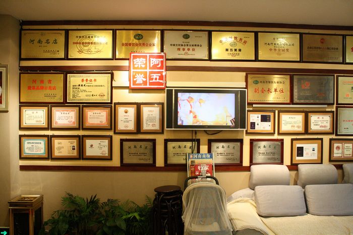 滿(mǎn)滿(mǎn)一面墻的獎(jiǎng)狀讓每一個(gè)來(lái)這里的人都能深刻的了解到阿五美食的嚴(yán)謹(jǐn)風(fēng)格,