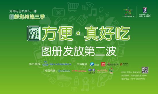 河南電臺(tái)私家車(chē)廣播2013大型公益系列活動(dòng)——“圖解鄭州”第三季圖方便·真好吃,圖冊(cè)發(fā)放第二波于2013年7月7日在鄭州市東風(fēng)路與天明路交匯處的天旺優(yōu)庫(kù)和商都路與七里河南路交匯處的華豐燈飾界免費(fèi)發(fā)放。