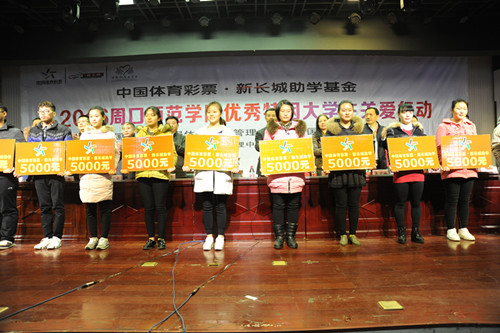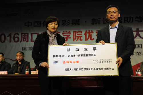 2016年12月7日、8日,中國體育彩票品牌公益項目“中國體育彩票新長城助學(xué)基金”2016年捐贈儀式分別在商丘師范學(xué)院和周口師范學(xué)院舉行。據(jù)悉,通過此次捐贈活動,河南省體育彩票管理中心共向兩個學(xué)校來自全國14省區(qū)的120名優(yōu)秀貧困大學(xué)生每人捐助5000元,幫助他們和他們的家庭,減輕學(xué)習(xí)生活中的經(jīng)濟(jì)負(fù)擔(dān)。