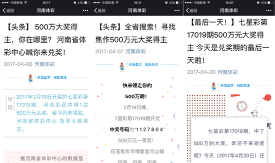 大獎中出之后,中獎人一直沒有到河南省體彩中心兌獎,而60天的兌獎有效期卻在一天一天流逝,眼看2017年4月20日的最后兌獎期限將至,為了更好的保護彩民利益,省體彩中心自2017年4月6日開始,通過省市網(wǎng)絡(luò)、報紙、廣播、官微、體彩銷售網(wǎng)點廣播消息和尋人啟事等多種形式發(fā)布消息,努力尋找和提醒中獎得主。