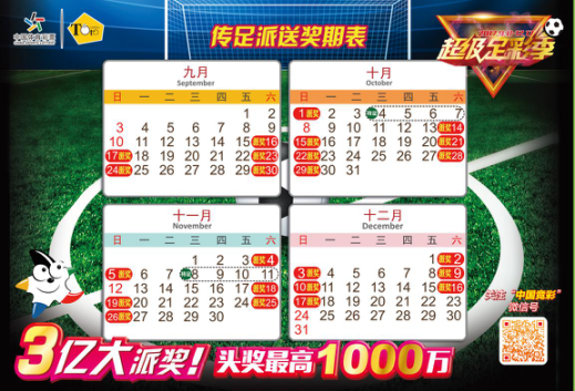 根據(jù)9月-12月的足彩競(jìng)猜場(chǎng)次安排,各周末獎(jiǎng)期受注賽事均以歐洲五大聯(lián)賽為主,其中9月份14場(chǎng)勝平負(fù)游戲和任選9場(chǎng)游戲的指定派獎(jiǎng)期為第17134期、17135期、17139期、17140期、17144期、17145期(10月1日停售)。也就是說(shuō),未來(lái)連續(xù)3個(gè)周末獎(jiǎng)期均有派獎(jiǎng)。今年10月2日-8日、11月6日-12日兩周是國(guó)際比賽日,周末五大聯(lián)賽將暫停,預(yù)計(jì)將指定當(dāng)周中獎(jiǎng)期派獎(jiǎng),受注賽事為各大洲世界杯預(yù)選賽及部分國(guó)家隊(duì)友誼賽。