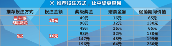 贈票活動不限投注方式,單式、復(fù)式、組合如中獎均可贈票。采用復(fù)式組合投注,獎金有可能會翻2倍、3倍或4倍,是真正的獎金會翻倍的彩票,尤其是現(xiàn)在活動升級,贈票金額翻倍,獎金更高更超值。