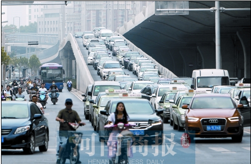 在大學(xué)路、嵩山路、桐柏路下橋口,車輛排隊(duì)下橋的情況也很嚴(yán)重。