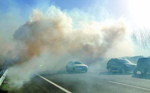 濃煙在高速路上彌漫,過往車輛只得降低速度,謹慎穿越濃煙。