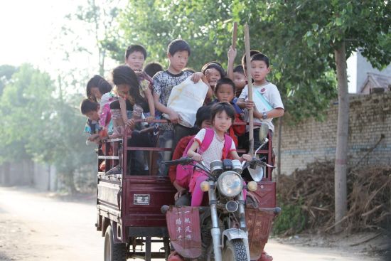 三輪摩托車(chē)開(kāi)進(jìn)鄭開(kāi)大道南邊的一個(gè)村子停了下來(lái)。此時(shí),我才發(fā)現(xiàn)真正在駕駛?cè)喣ν熊?chē)的是一位中年婦女,那個(gè)貌似在開(kāi)車(chē)的小女孩就坐在三輪摩托車(chē)的油箱上。為了看清道路,中年婦女不得不歪著腦袋開(kāi)車(chē)。車(chē)子停下時(shí),車(chē)上的孩子們紛紛跳下車(chē)向家中跑去。