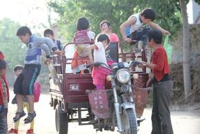 除了車(chē)斗里,連摩托車(chē)的油箱上也坐著個(gè)孩子