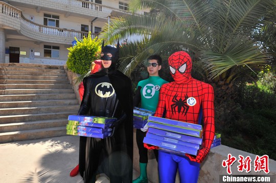 5月29日,在六一兒童節(jié)來臨之際,祥鵬航空的安全員變身超級(jí)英雄,來到云南省昆明市晉寧縣的學(xué)校,為長期資助的困難學(xué)生送上兒童節(jié)禮物。中新社發(fā) 劉冉陽 攝 5月29日,在六一兒童節(jié)來臨之際,祥鵬航空的安全員變身超級(jí)英雄,來到云南省昆明市晉寧縣的學(xué)校,為長期資助的困難學(xué)生送上兒童節(jié)禮物。