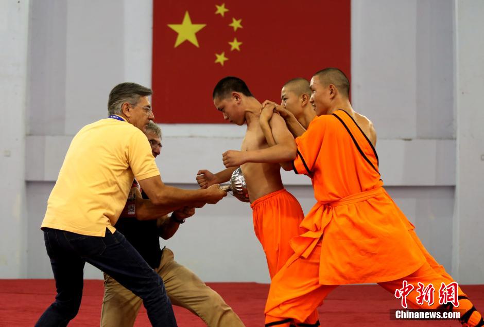9月20日,河南登封,前來(lái)參加2015鄭州航展的國(guó)際特技飛行員,在登封一所武校內(nèi)用力想拔掉吸在少林弟子肚子上的飯碗,但拼盡全力,也未能成功。 中新社發(fā) 王中舉 攝