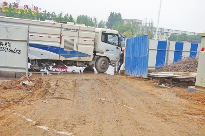 為了查個究竟,吳師傅等人順著泥印從路口向北尋找,很快找到路口北約150米路東側(cè)的一家工地。此時,仍有工程車和渣土車不斷從工地駛出。由于這些車的輪胎上粘滿泥巴,駛上馬路后,大量泥巴遺落在路面上,留下一道道黃泥印。“我們到工地討說法,卻無人照頭?!狈畮煾嫡f,上午9時30分,他們一氣之下,用一輛清掃車堵在工地大門口,以此阻擋工地上的施工車輛出門(如圖)。