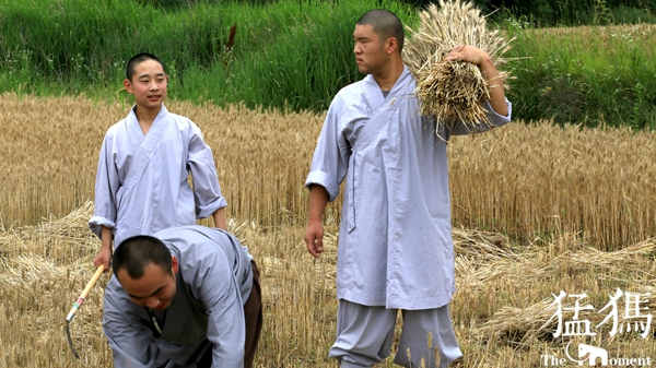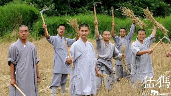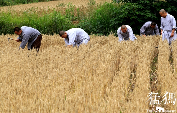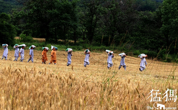 經(jīng)過一上午辛勤的勞作,少林寺僧眾們將收獲的麥子裝袋,在歡聲笑語中,肩抗著一袋袋麥子,搬送到運載車上。金黃色的麥桿,點綴著僧人們的灰色布袍,好像與天地一體,融成一幅和諧的畫卷……