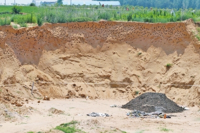 本報訊崖沙燕筑巢,工地停工保護。新鄭這一幕人與燕子和諧共處的情景曾被廣泛報道,但昨天上午大河報記者在新鄭市一處建筑工地看到,此前人鳥和諧共處的場景已經(jīng)不再,偌大一堆含有刺鼻藥味的垃圾堆在成千上萬個燕子窩下方,記者在此蹲守近四個小時,發(fā)現(xiàn)很少有燕子歸巢。