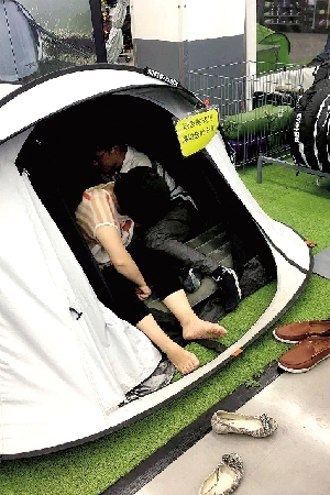 除此之外,戶外用品區(qū)也成為最受歡迎的展品區(qū)。因?yàn)檫@里擺放的大量戶外用品,如帳篷、充氣床、釣魚折疊椅等,都能供客人休息,很多一家三口在此休息。