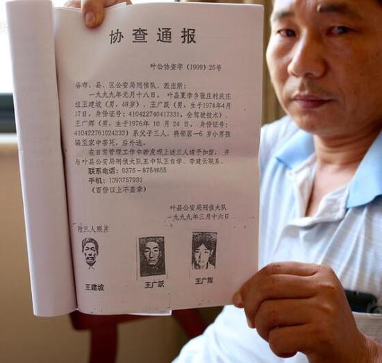 當(dāng)年被通緝的幾個(gè)人,被認(rèn)定嫌疑最大的王某躍至今未歸案。村民推斷,一個(gè)人較難完成殺人、埋尸、抬柜子掩藏。而且,葉縣警方信息顯示,王某躍患有精神疾病。不久后,公安局下發(fā)了協(xié)查通報(bào)稱(chēng),王某坡、王某躍、王某輝系父子三人,“將鄰居一6歲小男孩騙至家中害死,后外逃?!?/p>
