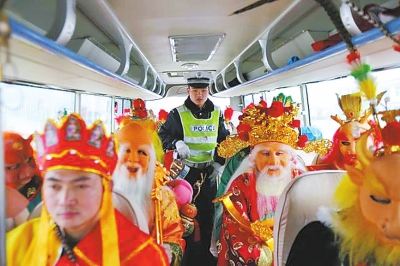 經(jīng)過省交警總隊核實,濟源市交警支隊民警在執(zhí)勤中確實遇到此事。大河報記者隨后聯(lián)系到濟源市交警支隊宣傳科相關(guān)人士,他講述了這個事情。2月7日,濟源交警在濟源市207國道執(zhí)法服務(wù)站執(zhí)勤時,在檢查點攔下了“孫悟空”駕駛的一輛大巴車,令交警想不到的是,車上居然還坐著一車《西游記》中的“神仙妖怪”,其中有“唐僧師徒”、“財神”、“土地神”、“小鉆風(fēng)”、“牛魔王”、“獅子精”、“白骨精”等,“當(dāng)時我們民警檢查時感覺自己‘穿越’了”。